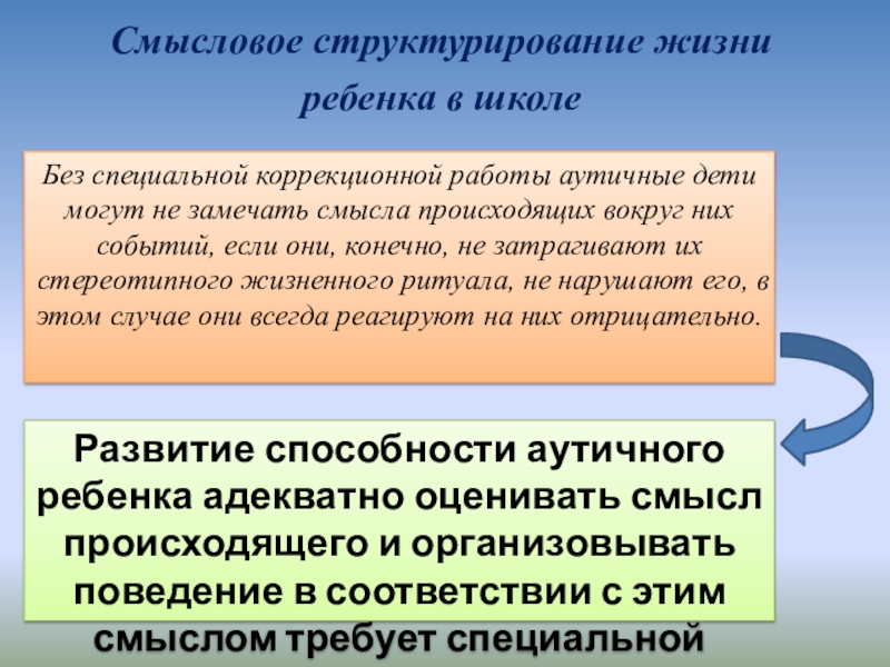 Развитие способности аутичного ребенка адекватно оценивать смысл происходящего и организовывать поведение в соответствии с этим смыслом требует специальной работы.