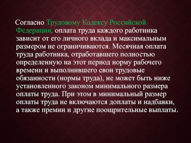 Слайд 27 Согласно Трудовому Кодексу Российской Федерации, оплата труда каждого работника зависит