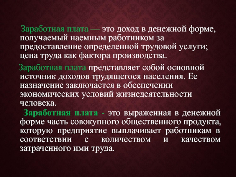 Заработная плата представляет собой основной источник доходов трудящегося населения. Ее назначение заключается в обеспечении экономических условий жизнедеятельности человека.