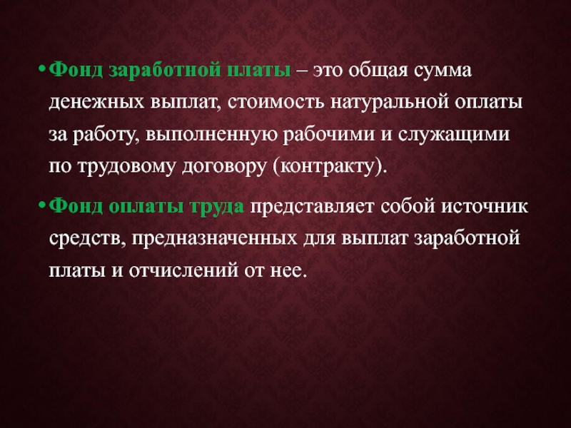 Слайд 30Фонд заработной платы – это общая сумма денежных выплат, стоимость натуральной