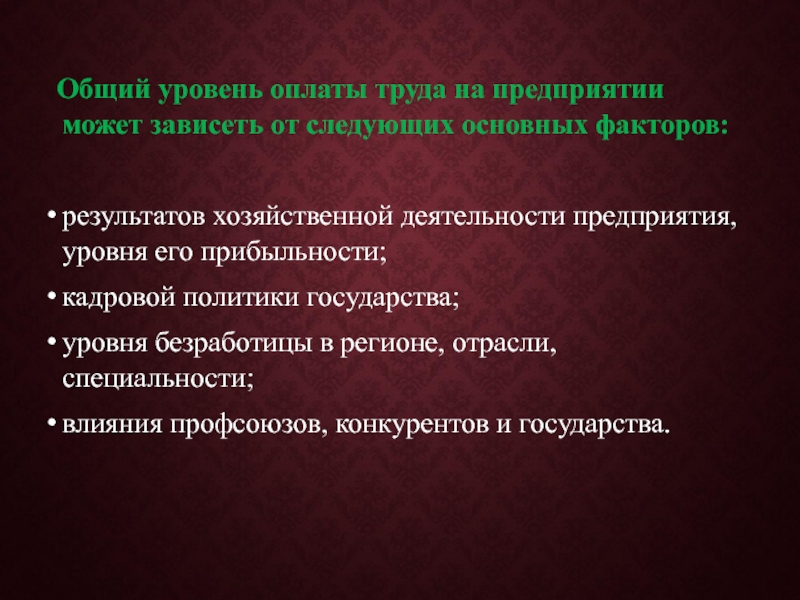 Слайд 28 Общий уровень оплаты труда на предприятии может зависеть от следующих