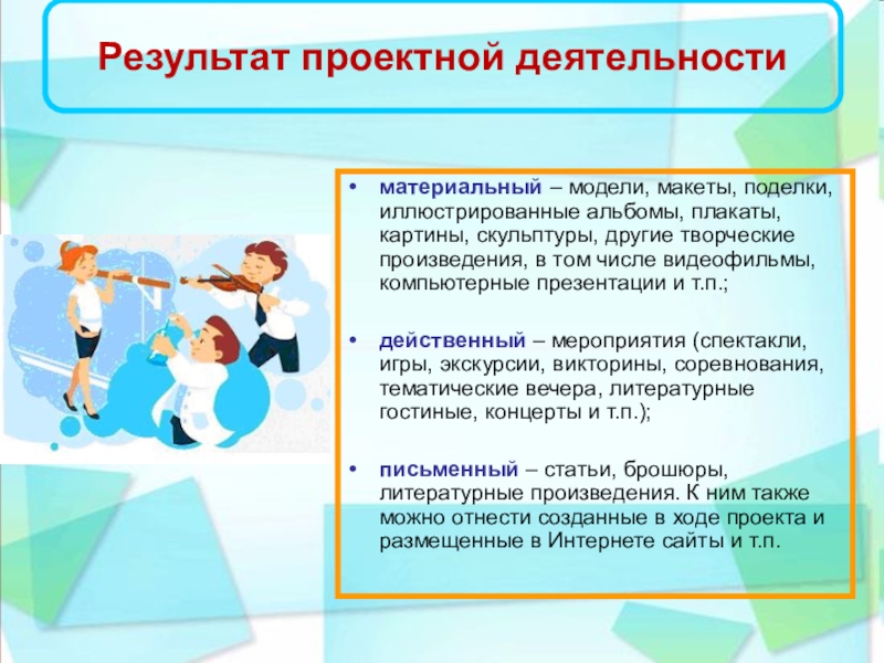 Продукт проектной и учебно – исследовательской деятельности должен носить с каждым годом для учащегося более совершенный характер по содержанию, оформлению, структуре, методам деятельности, практической и исследовательской значимости