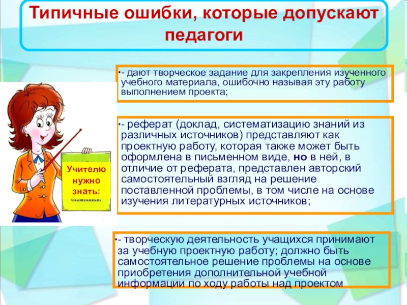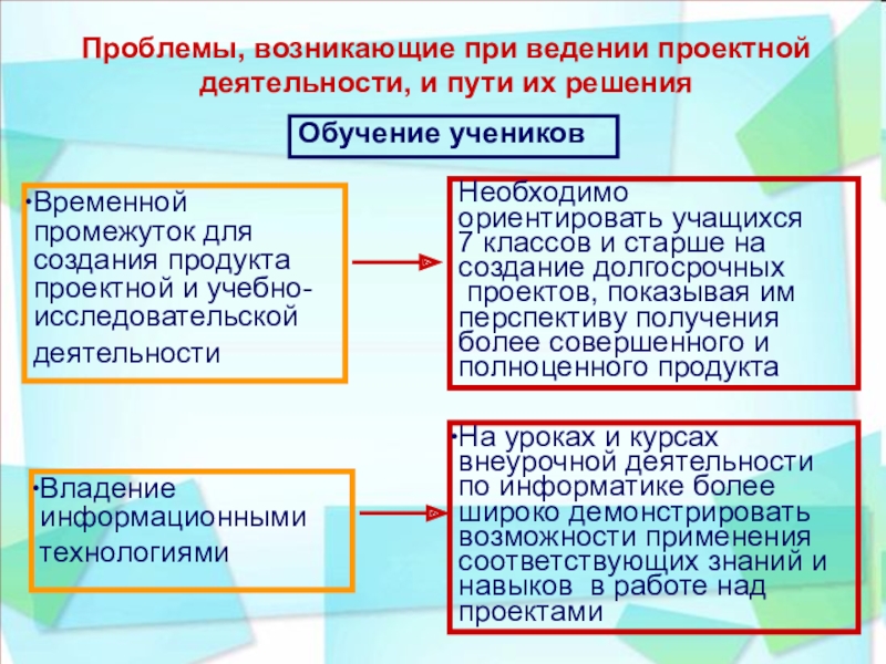 - творческую деятельность учащихся принимают за учебную проектную работу; должно быть самостоятельное решение проблемы на основе приобретения дополнительной учебной информации по ходу работы над проектом