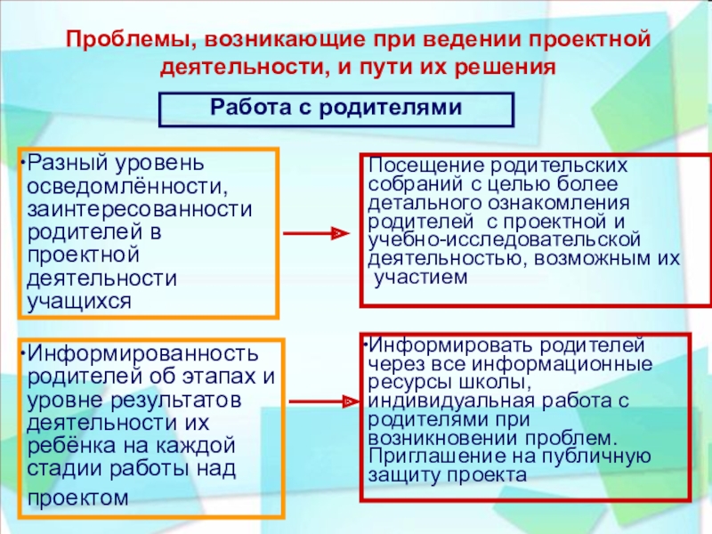 Информировать родителей через все информационные ресурсы школы, индивидуальная работа с родителями при возникновении проблем. Приглашение на публичную защиту проекта