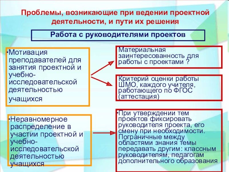 При утверждении тем проектов фиксировать руководителя проекта, его смену при необходимости. Пограничные между областями знания темы передавать другим: классным руководителям, педагогам дополнительного образования