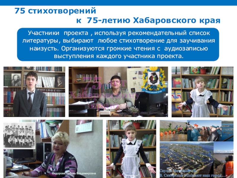 Участники проекта , используя рекомендательный список литературы, выбирают любое стихотворение для заучивания наизусть. Организуются громкие чтения с аудиозаписью выступления каждого участника проекта.