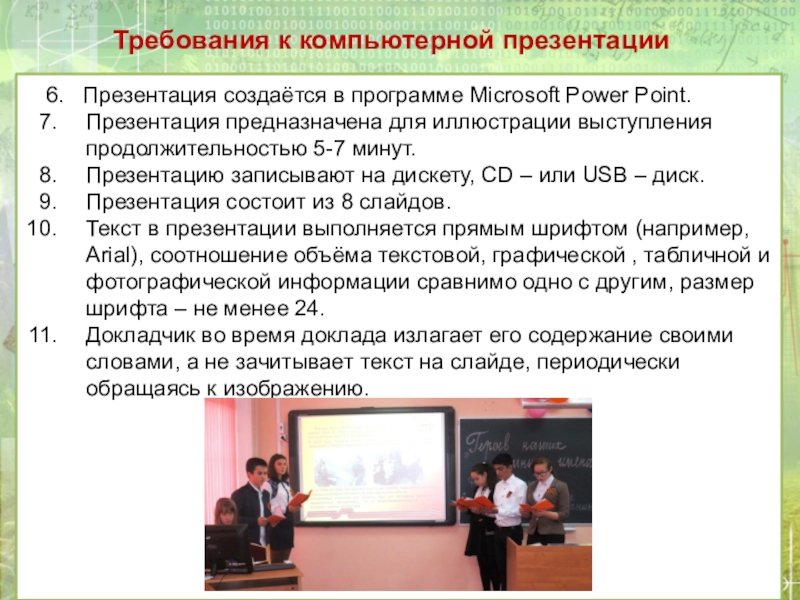 Докладчик во время доклада излагает его содержание своими словами, а не зачитывает текст на слайде, периодически обращаясь к изображению.