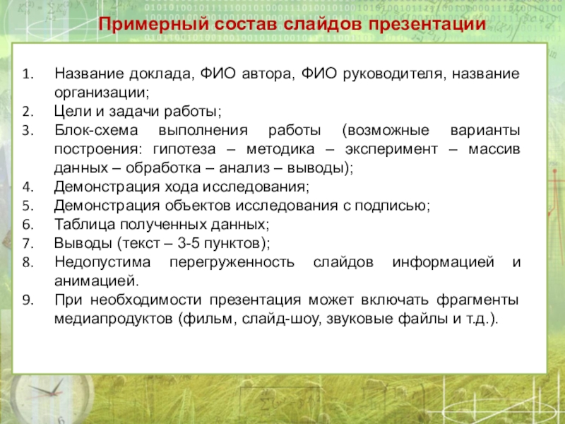 При необходимости презентация может включать фрагменты медиапродуктов (фильм, слайд-шоу, звуковые файлы и т.д.).