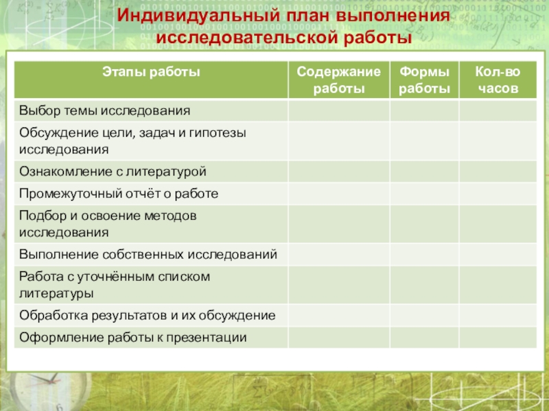 Слайд 19Индивидуальный план выполнения исследовательской работы