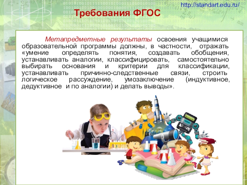 частности, отражать «умение определять понятия, создавать обобщения, устанавливать аналогии, классифицировать, самостоятельно выбирать основания и критерии для классификации, устанавливать причинно-следственные связи, строить логическое рассуждение, умозаключение (индуктивное, дедуктивное и по аналогии) и делать выводы».