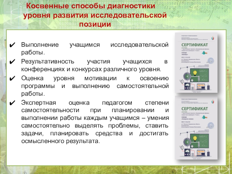 Слайд 26Косвенные способы диагностики уровня развития исследовательской позиции