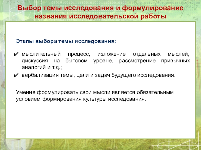 Умение формулировать свои мысли является обязательным условием формирования культуры исследования.