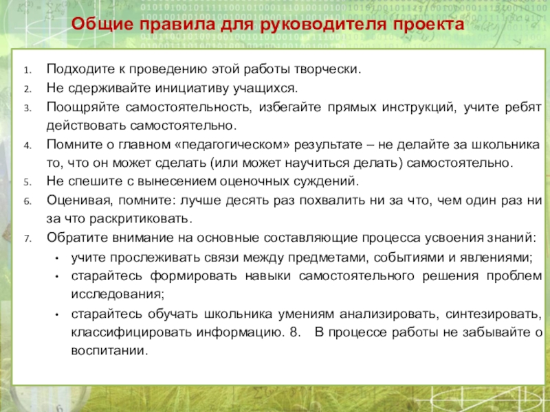 старайтесь обучать школьника умениям анализировать, синтезировать, классифицировать информацию. 8. В процессе работы не забывайте о воспитании.