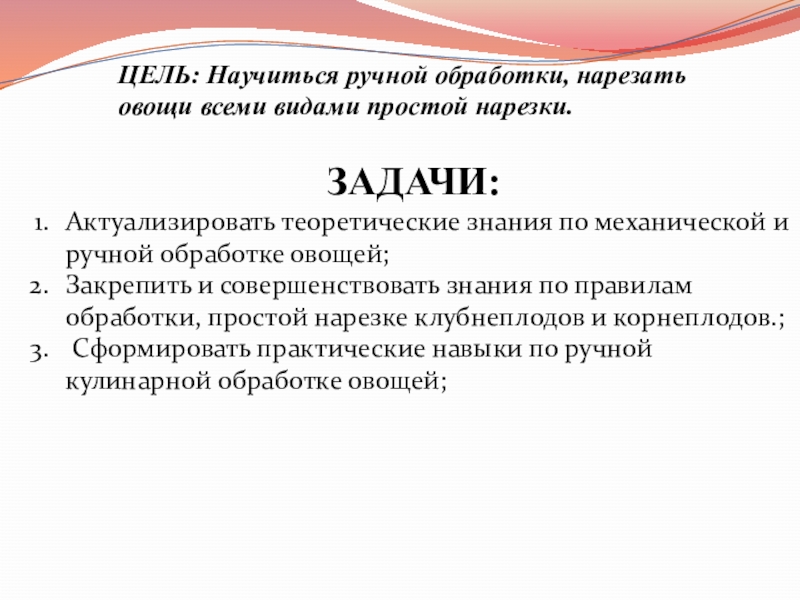 ЦЕЛЬ: Научиться ручной обработки, нарезать овощи всеми видами простой нарезки.