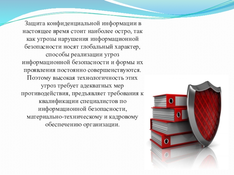 Защита конфиденциальной информации в настоящее время стоит наиболее остро, так как угрозы нарушения информационной
