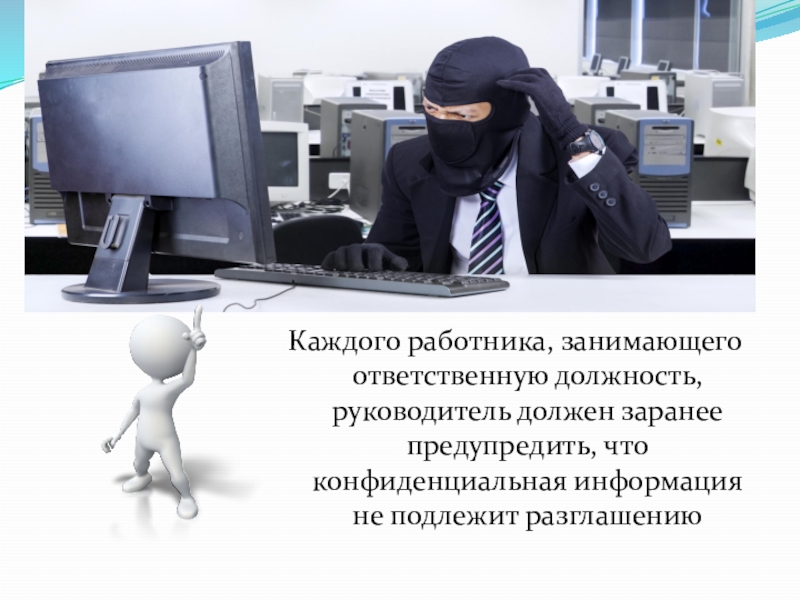 Слайд 6Каждого работника, занимающего ответственную должность, руководитель должен заранее предупредить, что конфиденциальная