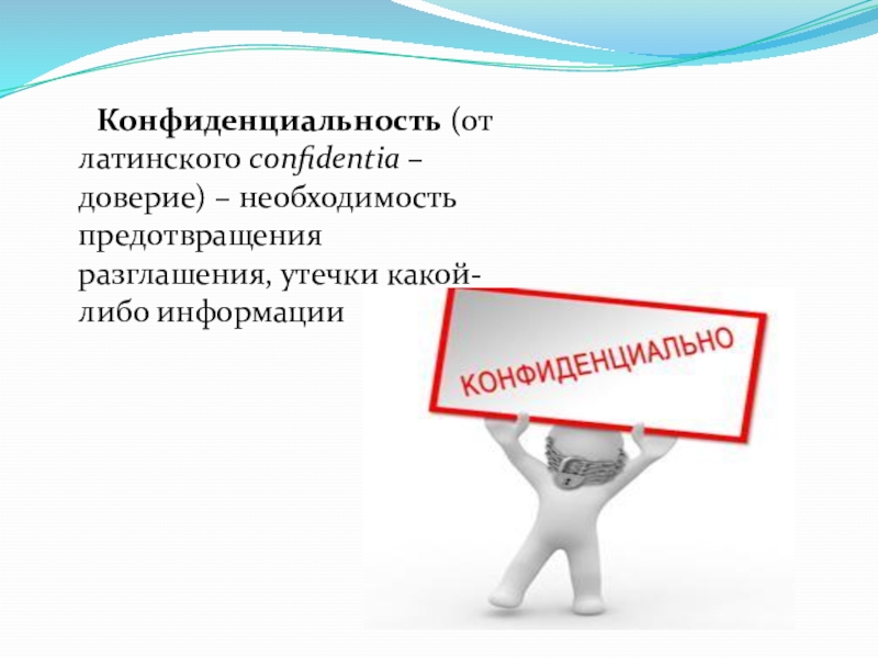 Слайд 5 Конфиденциальность (от латинского confidentia – доверие) – необходимость предотвращения разглашения, утечки
