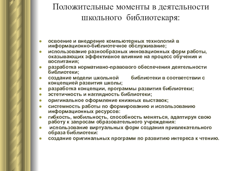 Слайд 25Положительные моменты в деятельности школьного библиотекаря: