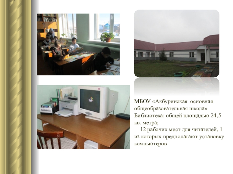 Слайд 6МБОУ «Акбуринская основная общеобразовательная школа» Библиотека: общей площадью 24,5 кв. метра;