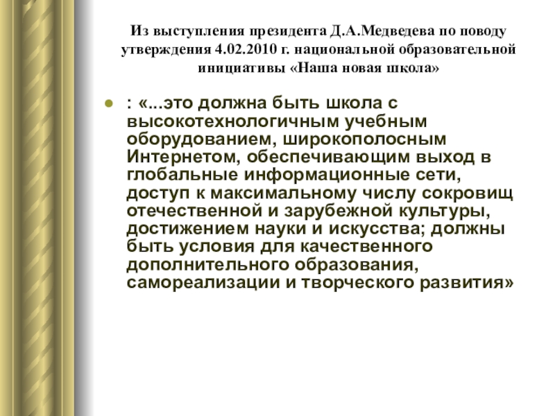 Слайд 5Из выступления президента Д.А.Медведева по поводу утверждения 4.02.2010 г. национальной образовательной