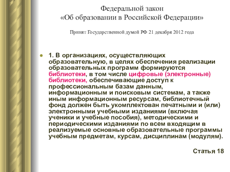 1. В организациях, осуществляющих образовательную, в целях обеспечения реализации образовательных программ формируются библиотеки, в том числе цифровые (электронные) библиотеки, обеспечивающие доступ к профессиональным базам данным, информационным и поисковым системам, а также иным информационным ресурсам, библиотечный фонд должен быть укомплектован печатными и (или) электронными учебными изданиями (включая ученики и учебные пособия), методическими и периодическими изданиями по всем входящим в реализуемые основные образовательные программы учебным предметам, курсам, дисциплинам (модулям).