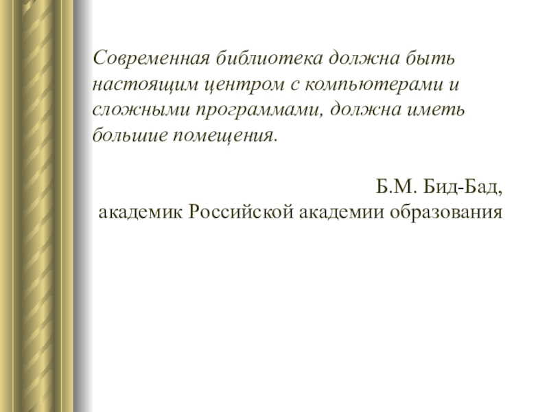 Слайд 2Современная библиотека должна быть настоящим центром с компьютерами и сложными программами,