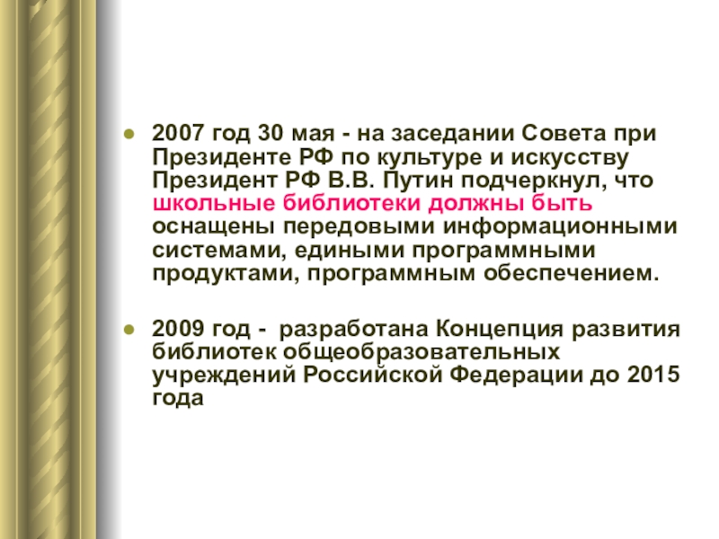 по культуре и искусству Президент РФ В.В. Путин подчеркнул, что школьные библиотеки должны быть оснащены передовыми информационными системами, едиными программными продуктами, программным обеспечением.