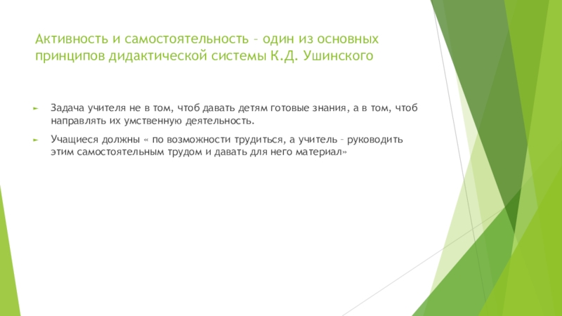 Учащиеся должны « по возможности трудиться, а учитель – руководить этим самостоятельным трудом и давать для него материал»