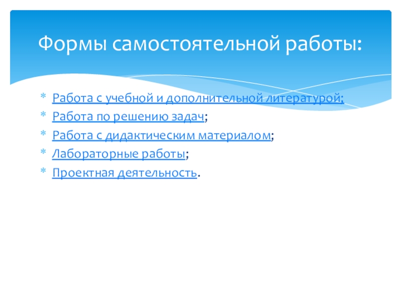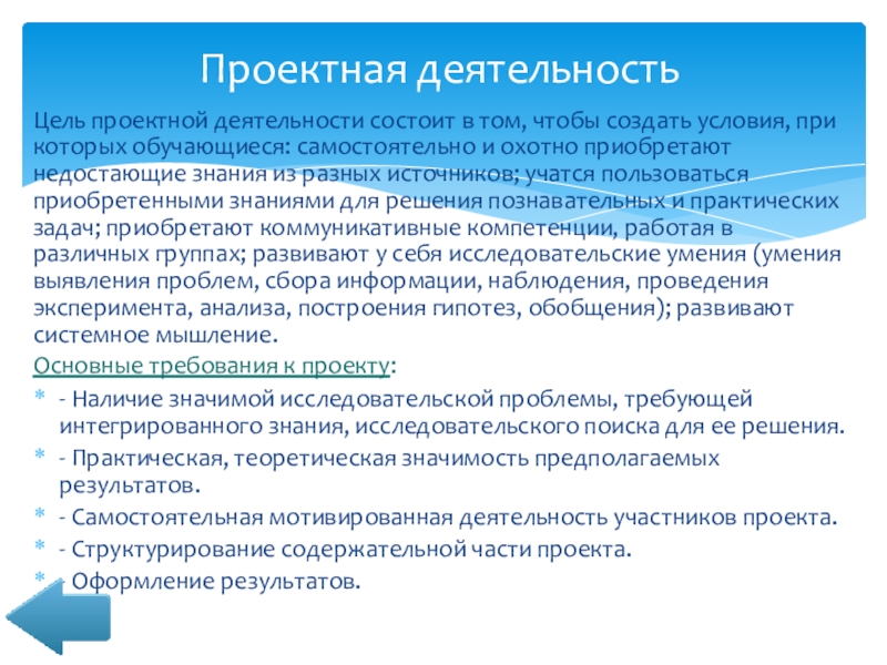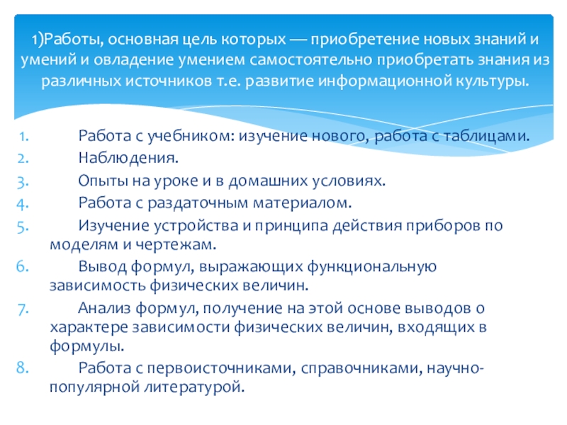 1)Работы, основная цель которых — приобретение новых знаний и умений и овладение умением самостоятельно приобретать знания из различных источников т.е. развитие информационной культуры.