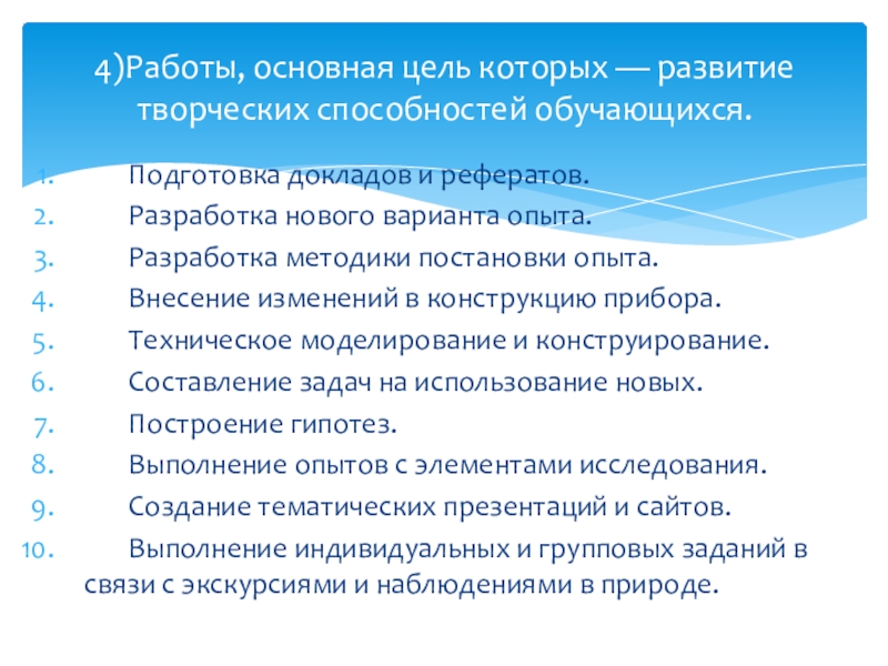 4)Работы, основная цель которых — развитие творческих способностей обучающихся.
