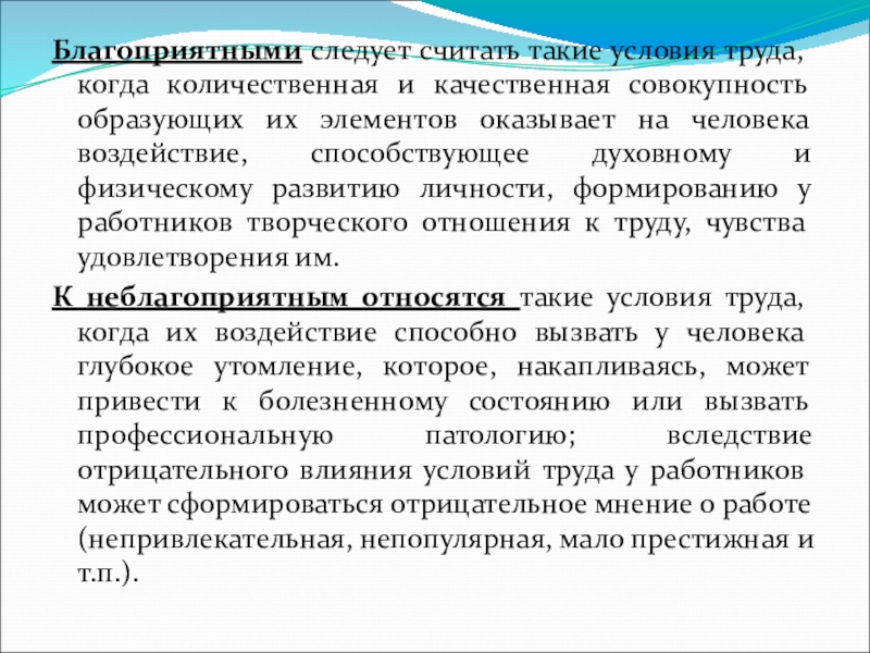 Слайд 6Благоприятными следует считать такие условия труда, когда количественная и качественная совокупность