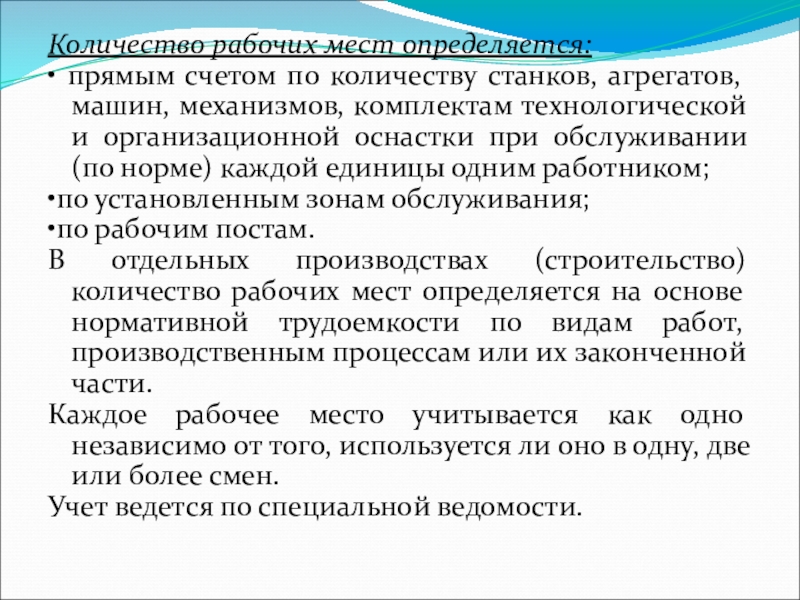 В отдельных производствах (строительство) количество рабочих мест определяется на основе нормативной трудоемкости по видам работ, производственным процессам или их законченной части.