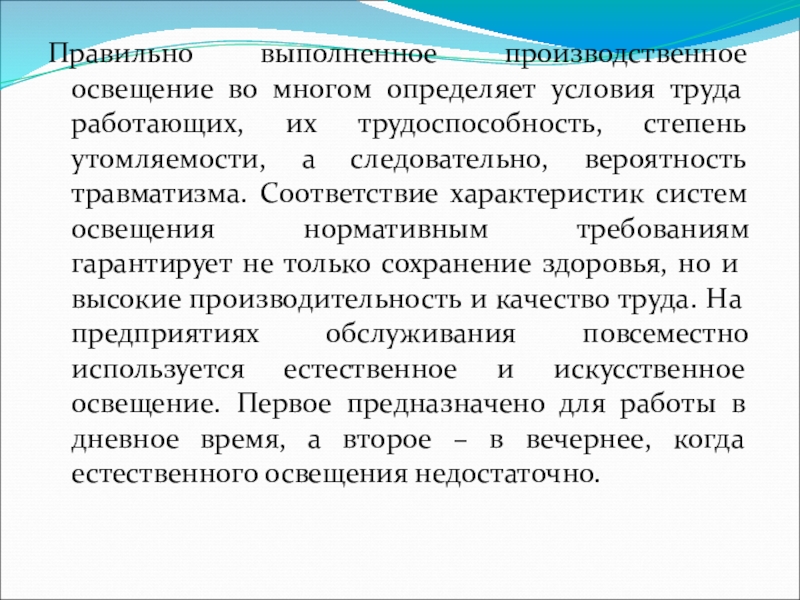 Слайд 8Правильно выполненное производственное освещение во многом определяет условия труда работающих, их
