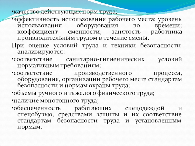 •соответствие производственного процесса, оборудования, организации рабочего места стандартам безопасности и нормам охраны труда;