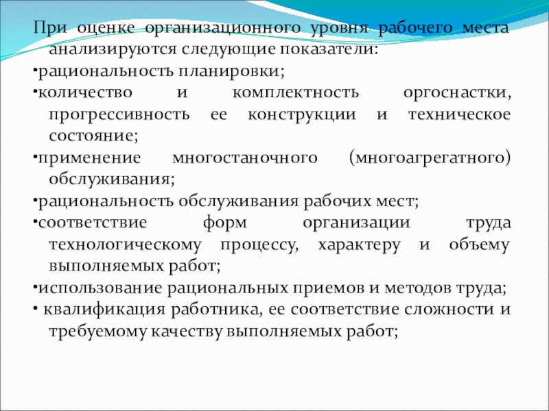 Слайд 12При оценке организационного уровня рабочего места анализируются следующие показатели: