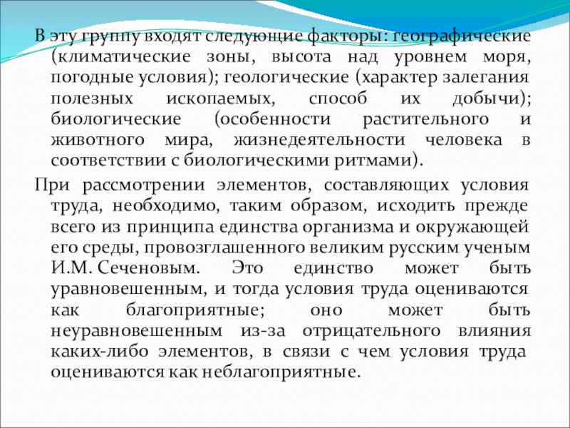 При рассмотрении элементов, составляющих условия труда, необходимо, таким образом, исходить прежде всего из принципа единства организма и окружающей его среды, провозглашенного великим русским ученым И.М. Сеченовым. Это единство может быть уравновешенным, и тогда условия труда оцениваются как благоприятные; оно может быть неуравновешенным из-за отрицательного влияния каких-либо элементов, в связи с чем условия труда оцениваются как неблагоприятные.