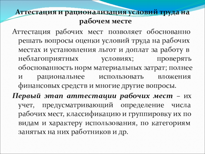 Слайд 9Аттестация и рационализация условий труда на рабочем месте