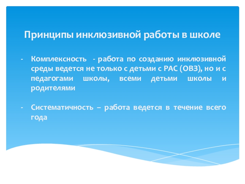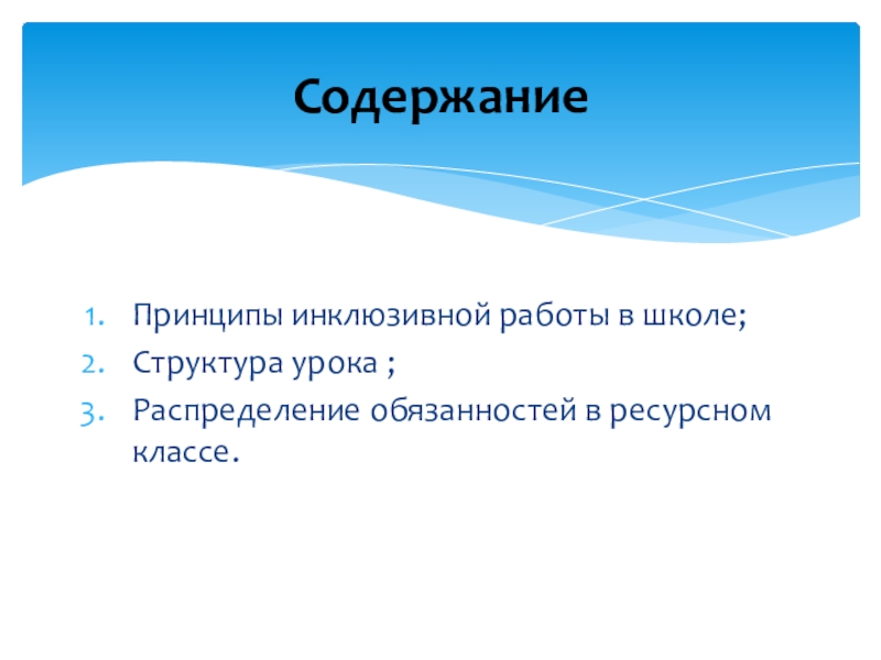 Слайд 2Принципы инклюзивной работы в школе;