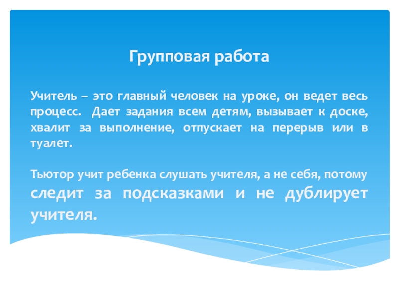 Тьютор учит ребенка слушать учителя, а не себя, потому следит за подсказками и не дублирует учителя.
