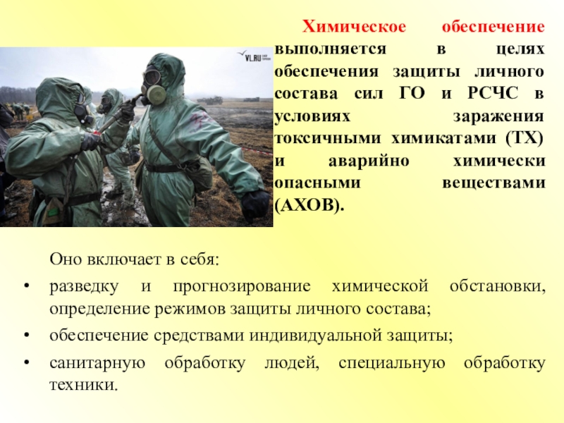 Химическое обеспечение выполняется в целях обеспечения защиты личного состава сил ГО и РСЧС в условиях заражения токсичными химикатами (ТХ) и аварийно химически опасными веществами (АХОВ).