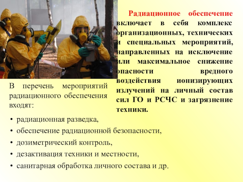 Радиационное обеспечение включает в себя комплекс организационных, технических и специальных мероприятий, направленных на исключение или максимальное снижение опасности вредного воздействия ионизирующих излучений на личный состав сил ГО и РСЧС и загрязнение техники.