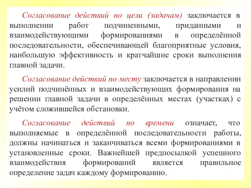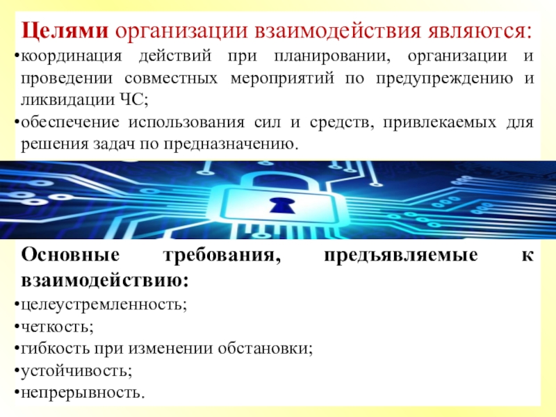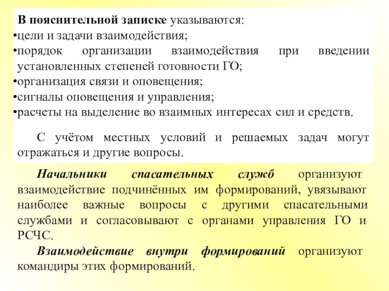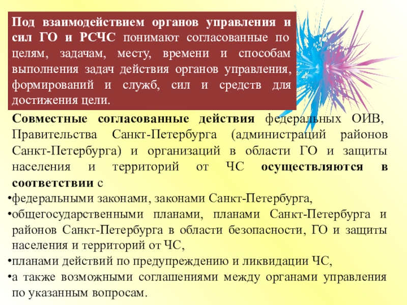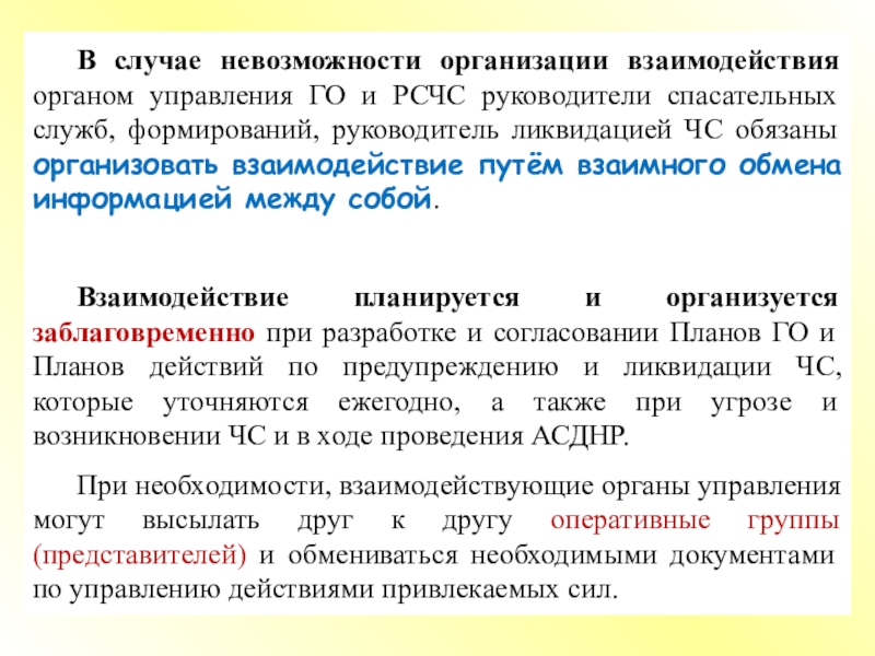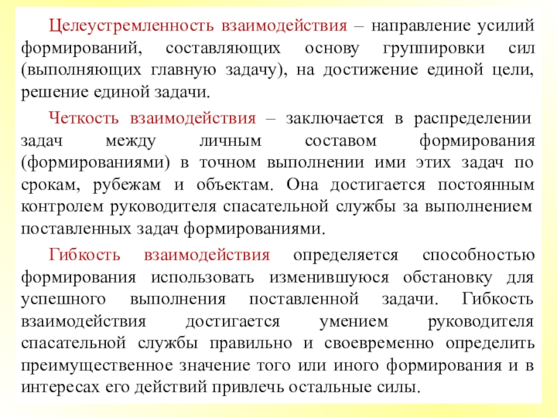 Под взаимодействием органов управления и сил ГО и РСЧС понимают согласованные по целям, задачам, месту, времени и способам выполнения задач действия органов управления, формирований и служб, сил и средств для достижения цели.