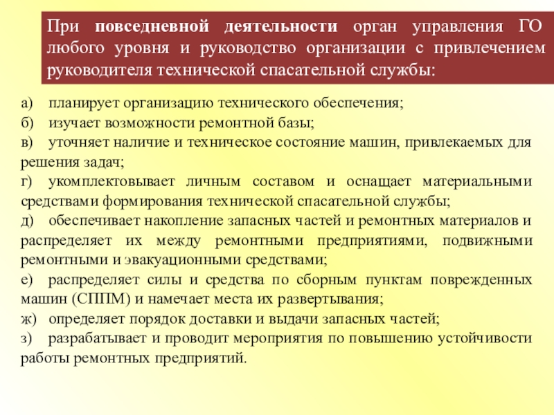 При повседневной деятельности орган управления ГО любого уровня и руководство организации с привлечением руководителя технической спасательной службы: