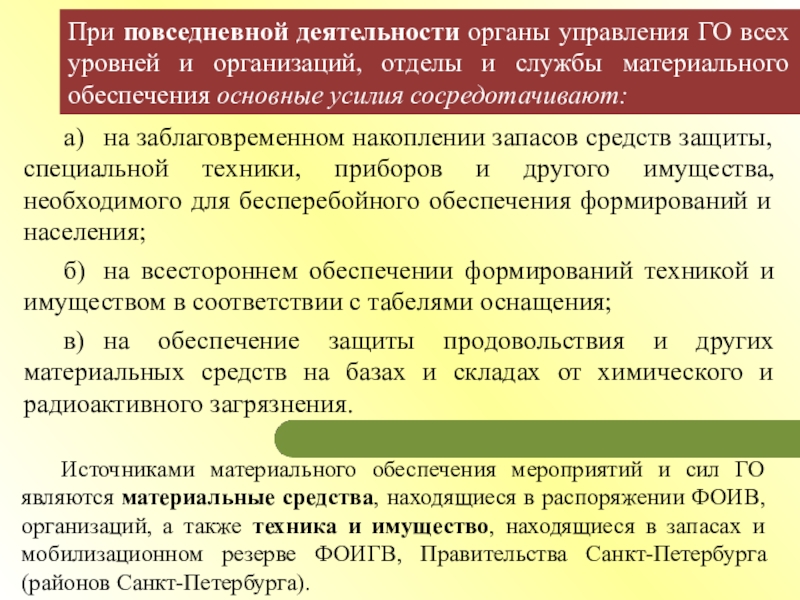 Источниками материального обеспечения мероприятий и сил ГО являются материальные средства, находящиеся в распоряжении ФОИВ, организаций, а также техника и имущество, находящиеся в запасах и мобилизационном резерве ФОИГВ, Правительства Санкт-Петербурга (районов Санкт-Петербурга).