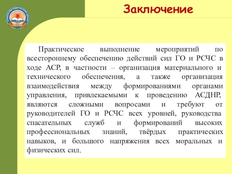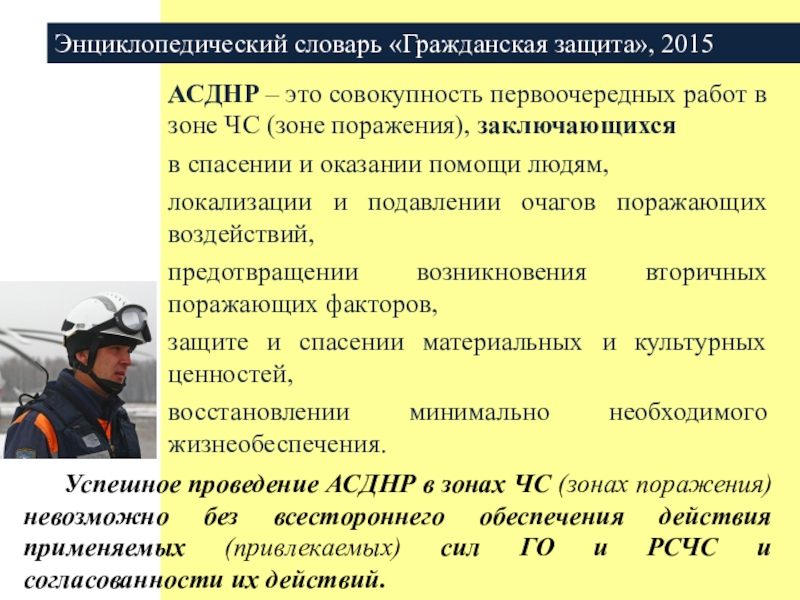 Успешное проведение АСДНР в зонах ЧС (зонах поражения) невозможно без всестороннего обеспечения действия применяемых (привлекаемых) сил ГО и РСЧС и согласованности их действий.