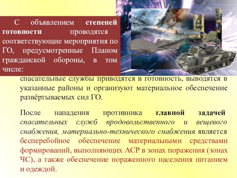 а) на заблаговременном накоплении запасов средств защиты, специальной техники, приборов и другого имущества, необходимого для бесперебойного обеспечения формирований и населения;