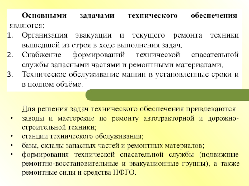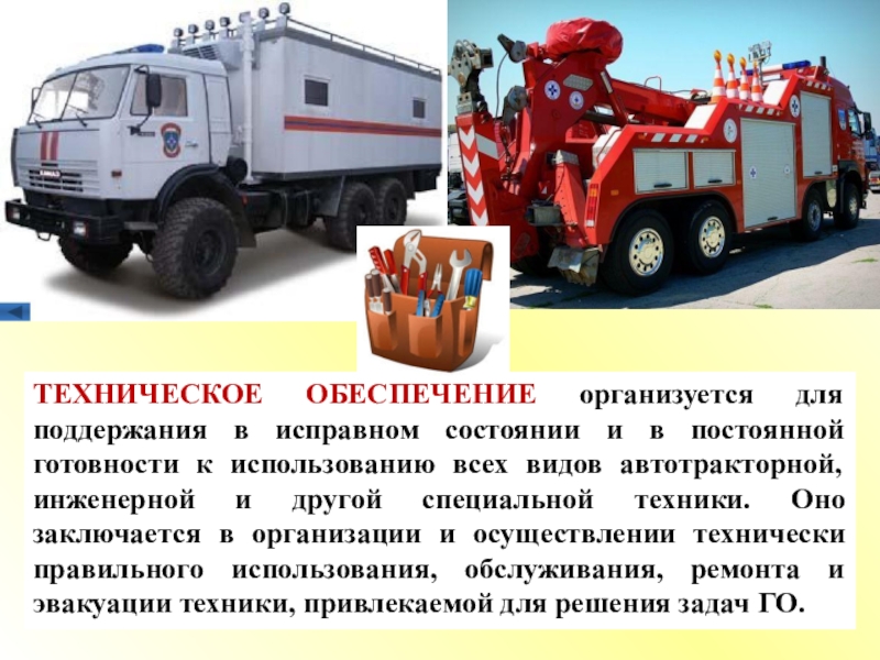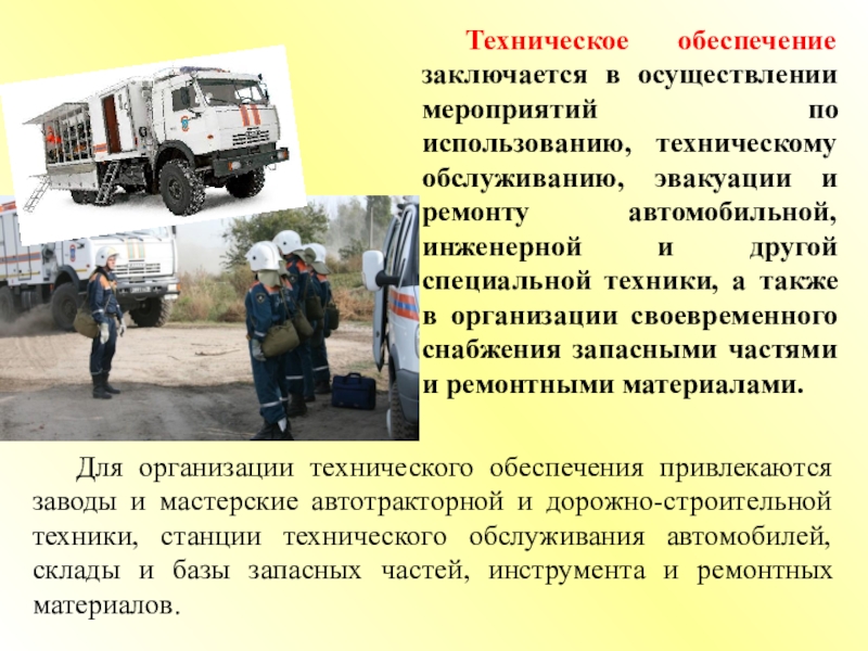 Техническое обеспечение заключается в осуществлении мероприятий по использованию, техническому обслуживанию, эвакуации и ремонту автомобильной, инженерной и другой специальной техники, а также в организации своевременного снабжения запасными частями и ремонтными материалами.