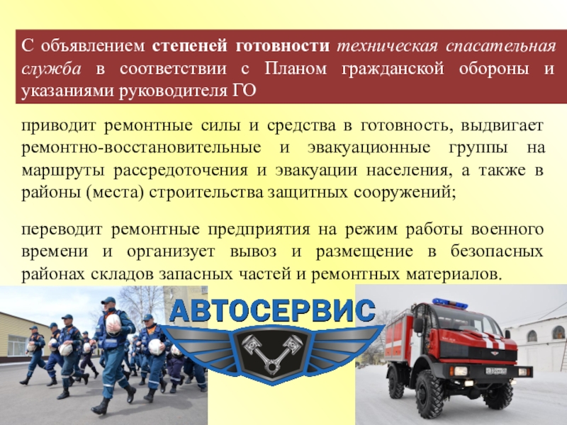 приводит ремонтные силы и средства в готовность, выдвигает ремонтно-восстановительные и эвакуационные группы на маршруты рассредоточения и эвакуации населения, а также в районы (места) строительства защитных сооружений;