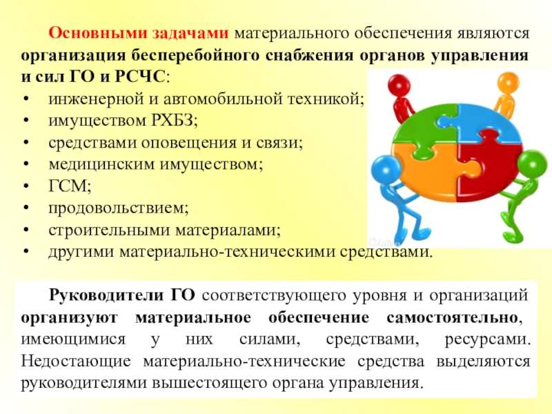 Руководители ГО соответствующего уровня и организаций организуют материальное обеспечение самостоятельно, имеющимися у них силами, средствами, ресурсами. Недостающие материально-технические средства выделяются руководителями вышестоящего органа управления.