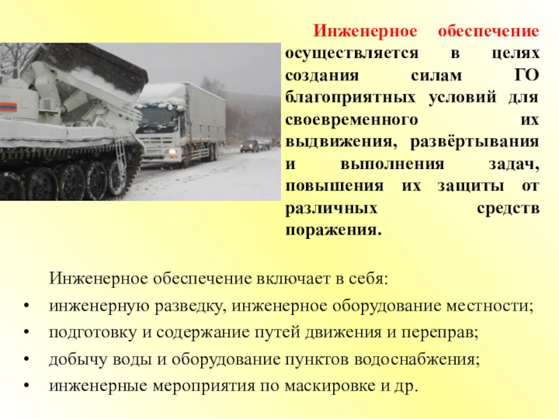 Инженерное обеспечение осуществляется в целях создания силам ГО благоприятных условий для своевременного их выдвижения, развёртывания и выполнения задач, повышения их защиты от различных средств поражения.
